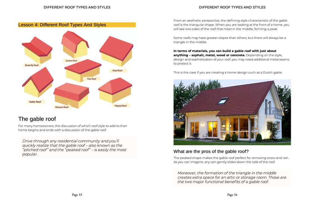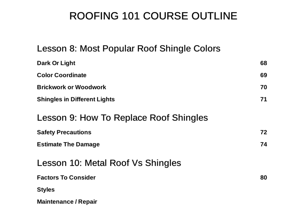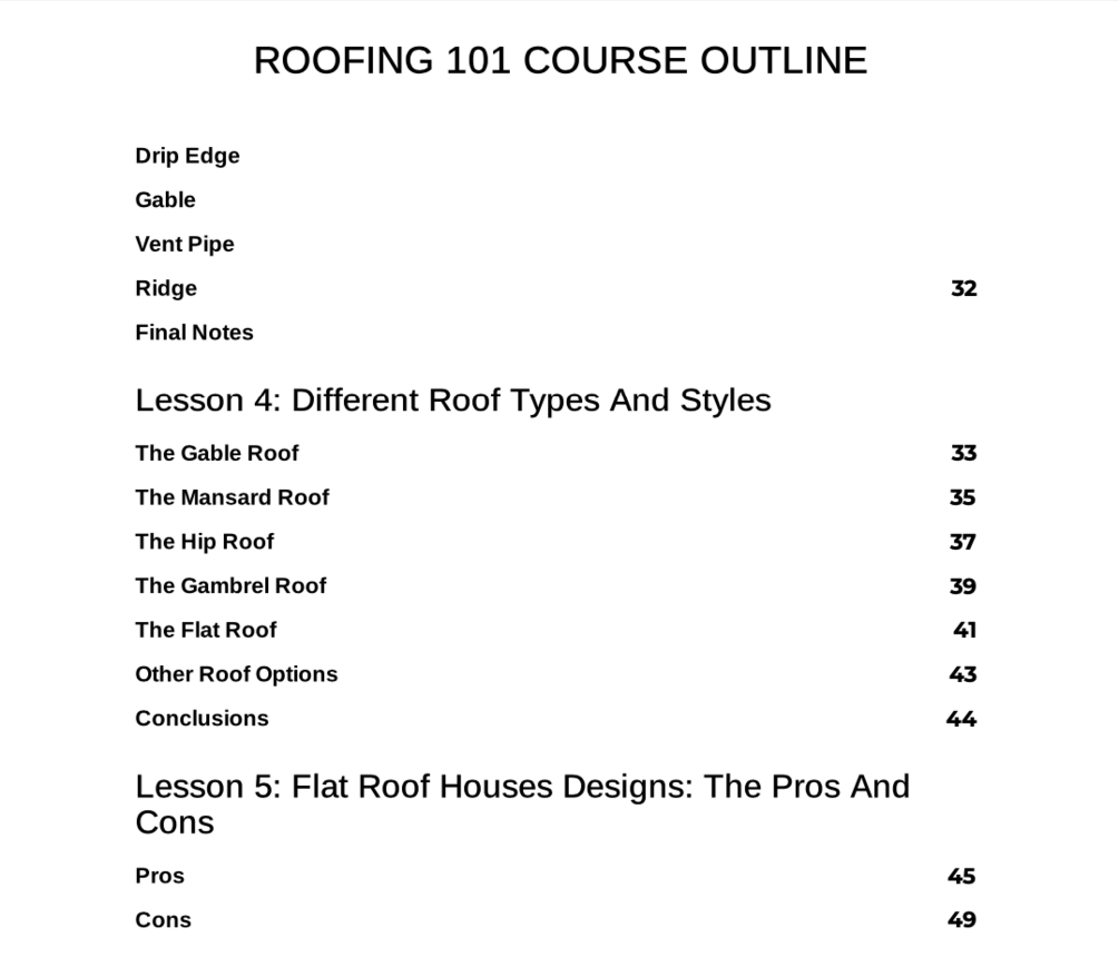 1. A complete roofing divided into 5 sections of 21 easy-to-digest lessons. Spans on 150 pages. Worth $107